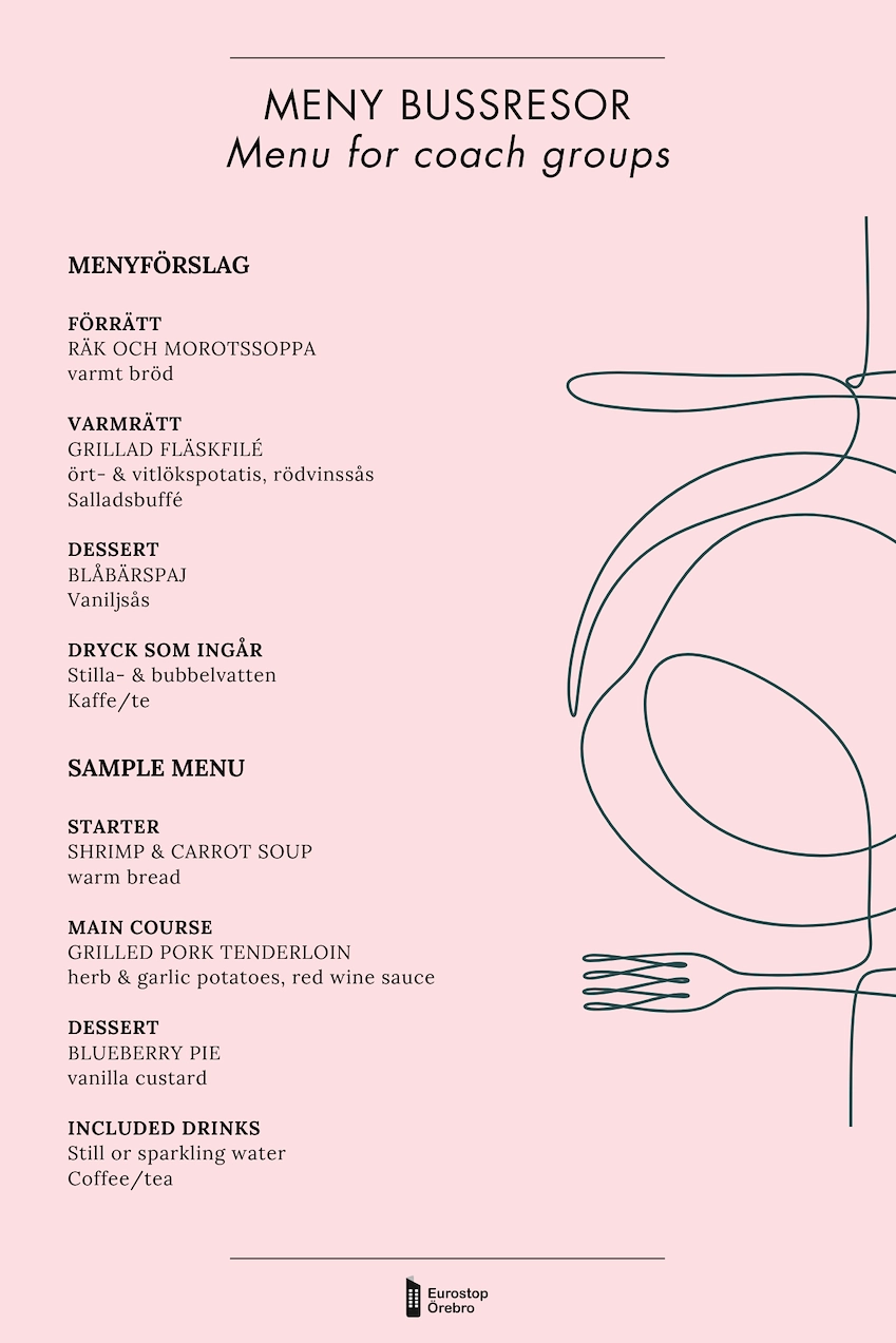 Vårt kök hjälper gärna till att anpassa menyn efter er grupps önskemål. Föredrar ni ett lättare alternativ med bara 1 eller 2 rätter? Inga problem – det ordnar vi! I måltiden ingår stilla eller kolsyrat vatten, en fräsch salladsbuffé samt kaffe eller te efter maten. För den som önskar något extra har vår Bistro fullständiga rättigheter, och gäster är därför välkomna att köpa till dryck till sin måltid. Vi ser fram emot att göra er gruppmåltid både god och minnesvärd!